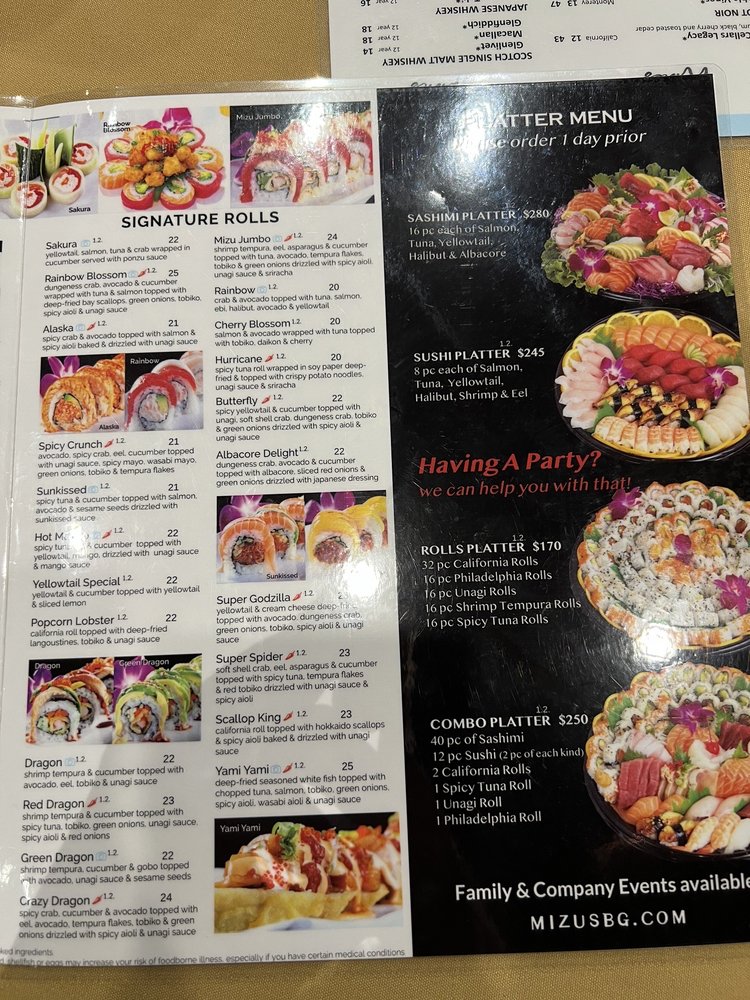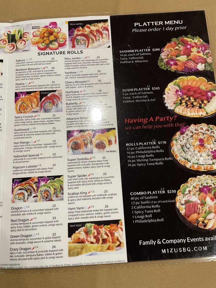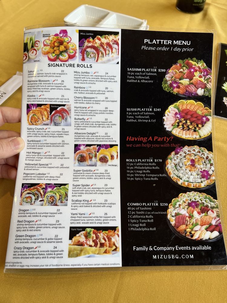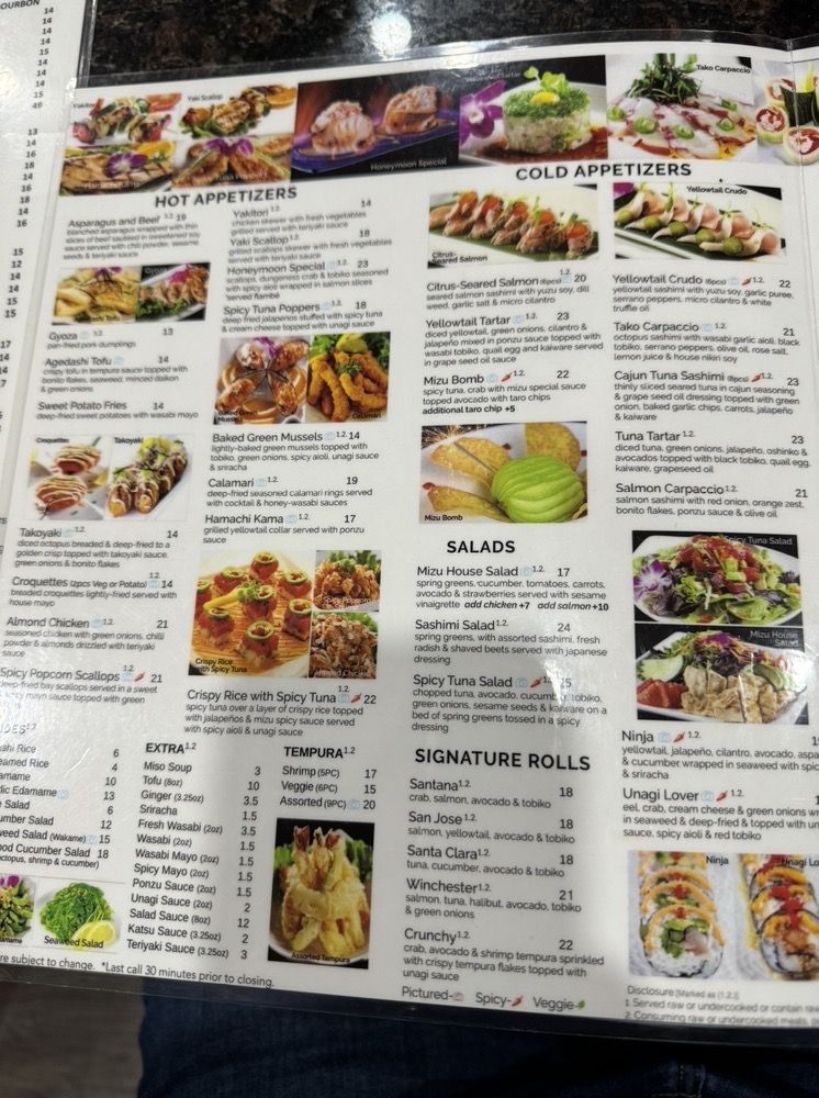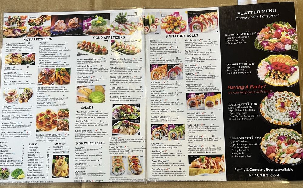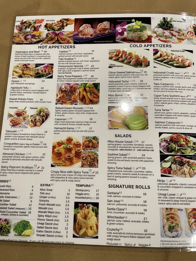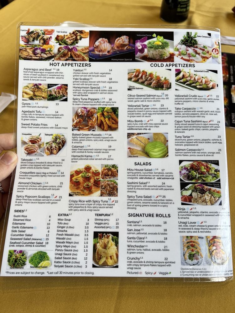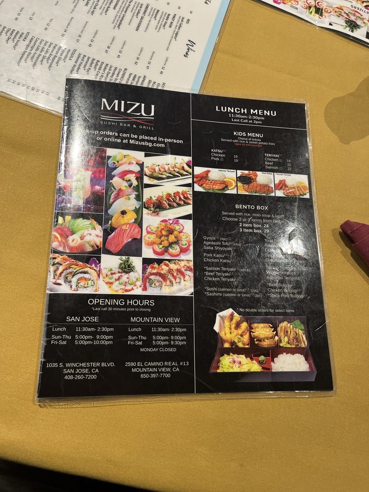 Mizu Sushi Bar & Grill offers a diverse menu with cold and hot appetizers, salads, and various sushi rolls. Standout dishes include the Yellowtail Crudo Spicy, Mizu Bomb, and Crispy Rice with Spicy Tuna. The restaurant provides a trendy and casual dining atmosphere, with options for vegan and vegetarian guests. Customers praise the excellent service and unique menu offerings, such as the truffle-infused Yellowtail Crudo. While prices may be on the higher side, the quality and flavor profiles of the dishes are worth it. With ample parking and a friendly staff, Mizu Sushi Bar & Grill is a top choice for high-quality sushi in the San Jose area. Make sure to make a reservation, as the restaurant can get crowded during peak hours.